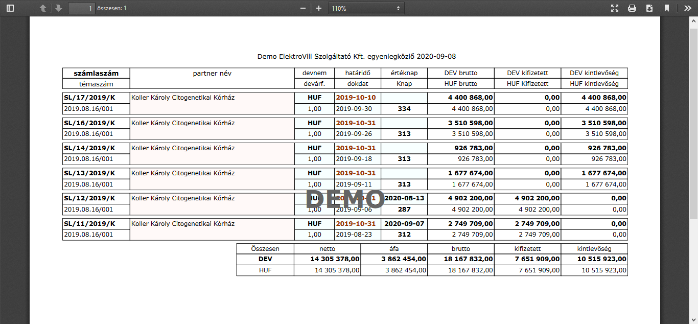 A gombra kattintva a bizonylatlistában aktuálisan szereplő összes bizonylat fizetési adatait PDF állományba rendezi és új lapon megnyílik az egyenlegközlő előnézete.