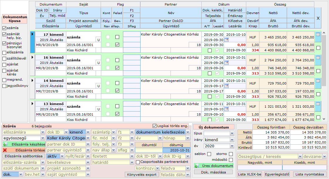 Példa egy kiválasztott partner összes kimenő számlájának (a kifizetett és a részlegesen kifizetett számlákat is beleértve) szűrési beállításához: