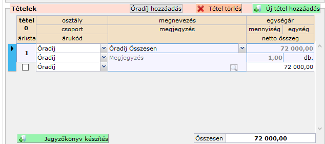 A bal oldali hasábban a 'Tételek' felső szekciójában kattintsunk az  'Óradíj hozzáadás' gombra, ezzel a rendszer automatikusan hozzáadja a dolgozóink összesített munkadíját a tételek sorához.