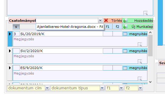 Egy űrlaphoz csatolt fájlt megnyithatunk, ha a csatolmányok listában rákattintással kijelöljük és megnyomjuk a 'Megnyitás' gombot. Ekkor új lapon megnyílik a Fájlok űrlap, a listában pedig automatikusan a keresett fájl lesz kijelölve.