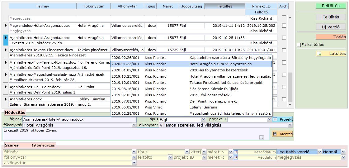 A Fájlok űrlapon lehetőségünk van egy Projekthez csatolni a kiválasztott állományt, amit megtehetünk közvetlenül a feltöltés után, a projekt űrlap megnyitása nélkül is.