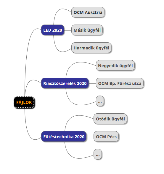 Ha a projektjeinket tudjuk tipizálni, ám nagyszámú ügyfélkörnek dolgozunk és mindig újabb és újabb ügyfelek rendelnek meg projekteket, akkor célszerű a főkönyvtárak esetében a projekt típusával és az évszámokkal operálni, az alkönyvtárak neve lehet az ügyfél neve és alternatívaként a helyszín.