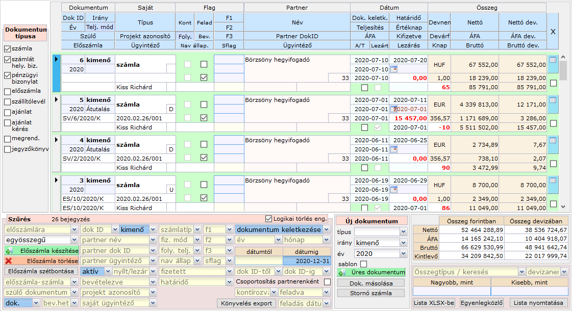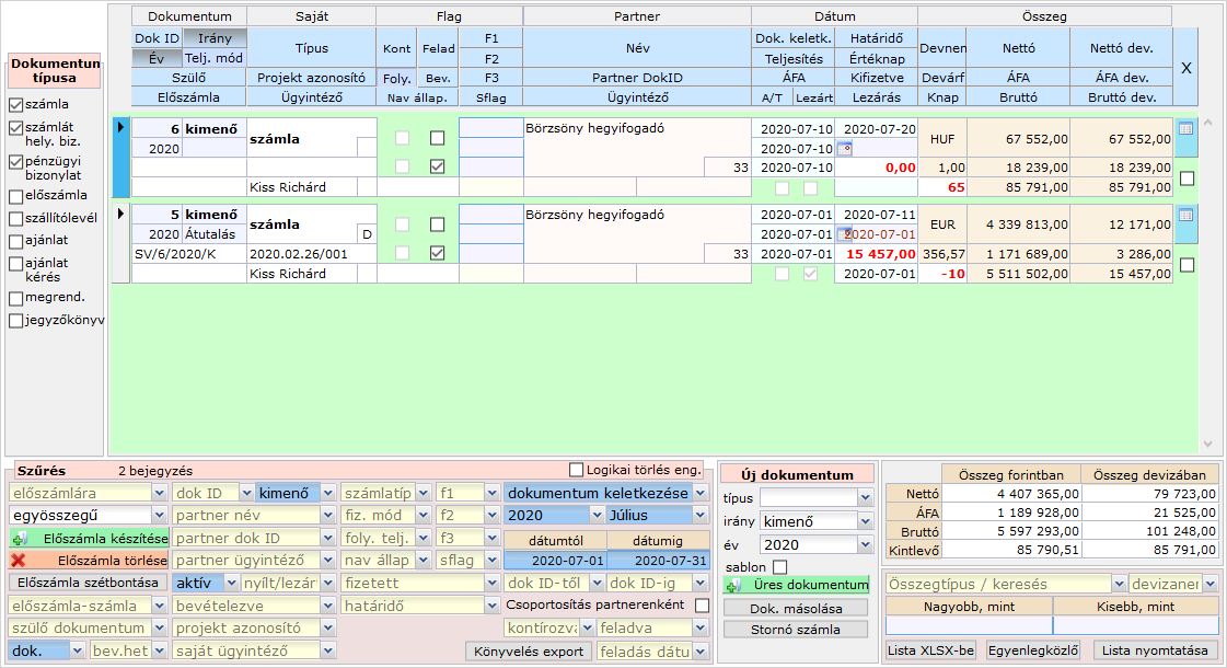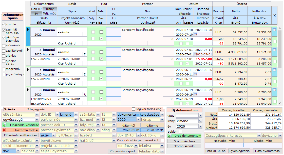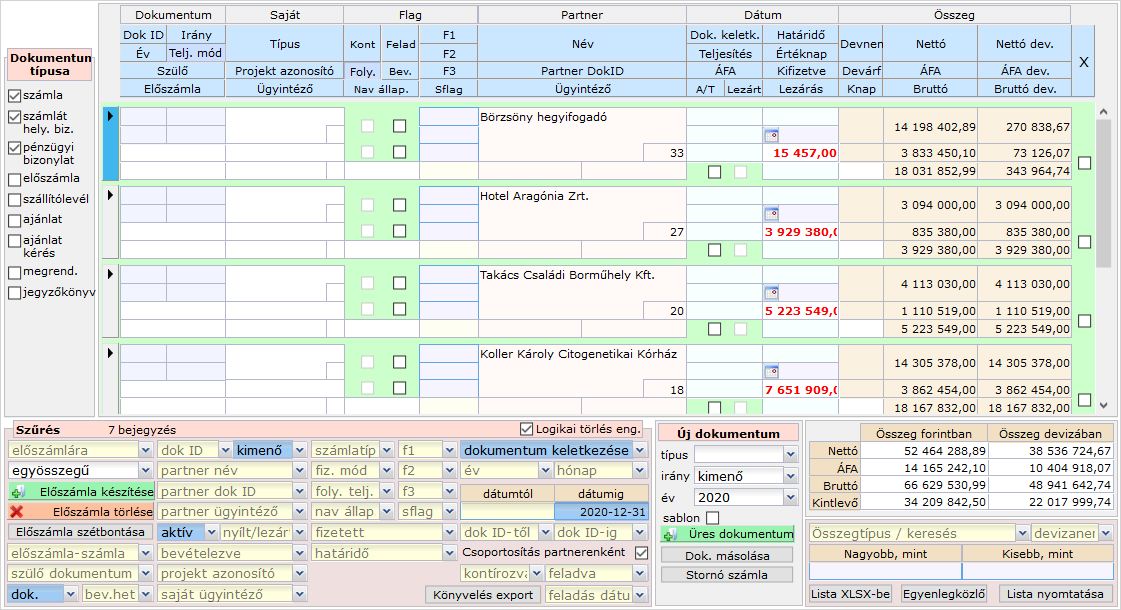 Ennek hatására a lista egy sorában egy partner vonatkozásában az összegszerű adatok kumulált módon jelennek meg. Értelemszerűen az egyes bizonylatok adatai (pl. azonosító, dátum stb...) nem jelennek meg.
