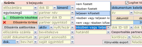 Ugyanígy lehetőségünk van a csak részben kifizetett összegű bizonylatokat listázni, illetve a teljesen van részben fizetetteket.