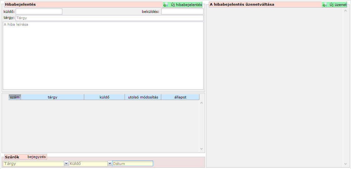Demó és éles rendszerben is a megigénylés pillanatában a hibabejelentőben egyetlen bejelentés sem szerepel, az űrlap mezői üresek.