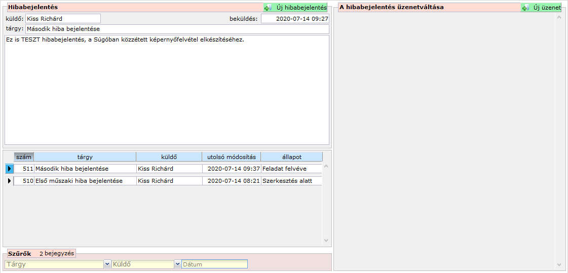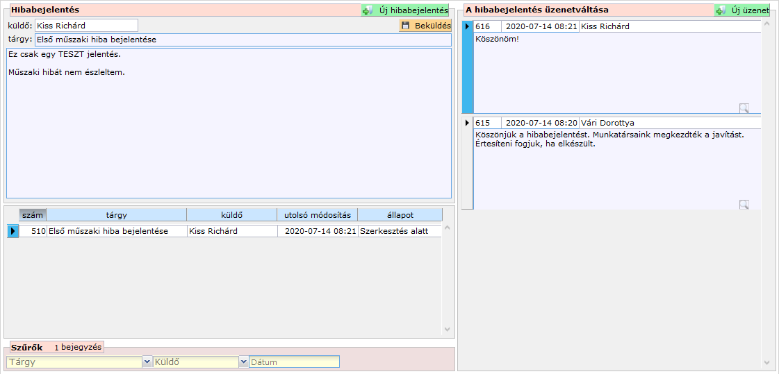- a lista fölötti mezőkben (beküldő neve, tárgy és leírás) mezőkben megjelenik a hibabejelentés