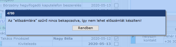 Például a Munkalapok űrlapon nem választottunk ki legalább egy űrlapot és nem szűrtük le a listát az előszámlára szánt tételekre, majd így kattintottunk az 'Előszámla készítése' parancsgombra. Ez esetben a rendszer - helyesen - párbeszédablakban tájékoztat minket a hiányzó lépésekről.