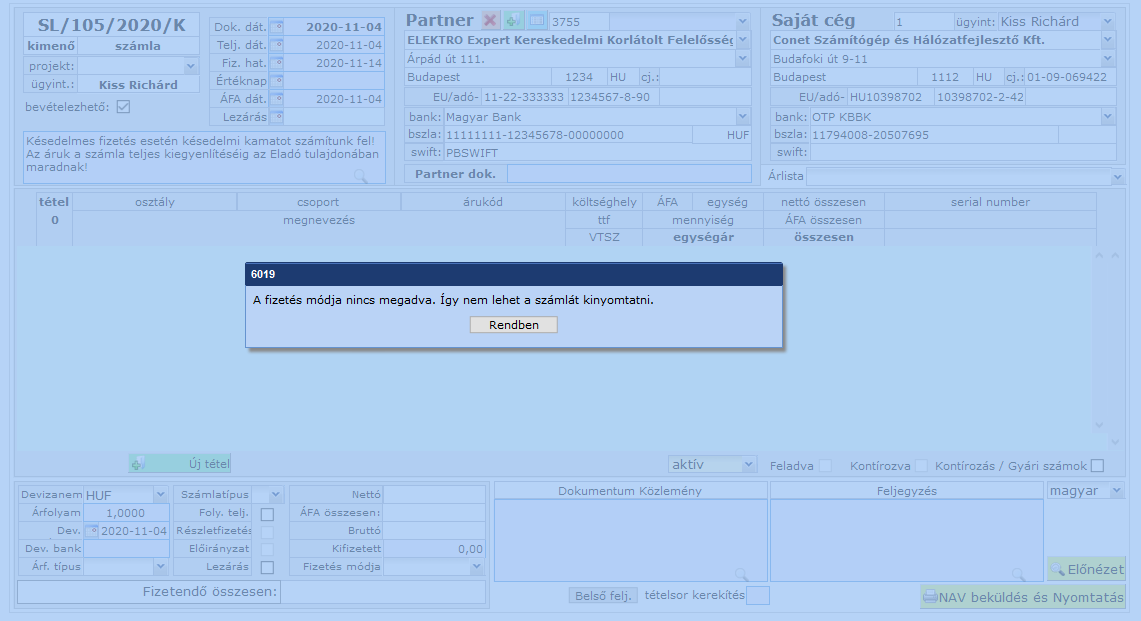 A számla ellenőrzésekor egy sor ellenőrzést hajt végre a rendszer. Ha hibát talál, nem küldi be a NAV rendszerébe, hibaüzenetben értesít minket erről, megjelöli a hiba természetét és felajánlja a hiba kijavítását. Például: