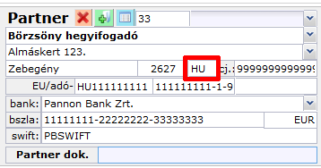 Ez esetben nyissuk meg a Partnerek űrlapot, keressük meg a szóban forgó üzleti partnerünk rekordját, majd a Címek szekcióban a számlázási cím rovatban az ország legördülő listában válasszuk ki a megfelelő országot. Majd a Bizonylat részletei űrlapon válasszuk ki újra a partnert Ekkor a rendszer beírja az ország kétbetűs kódját a jelzett rovatba.