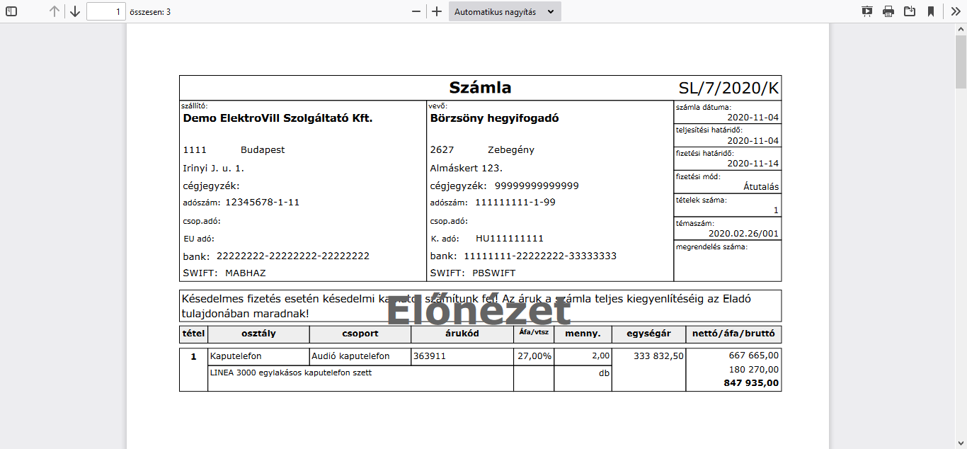 * Megjegyzés: a ténylegesen beküldött számla esetében nem előnézetet kapunk, hanem a tényleges számlát.