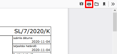 Kattintsunk a képen is jelzett, a böngészőnk jobb felső sarkában megjelenő nyomtatás ikonra, ekkor a beállított nyomtatónk segítségével papírhordozón kapjuk meg a számlát. Így lehetőségünk hagyományos (offline) úton továbbítani az üzleti partnerünknek azt (postai úton vagy személyesen).