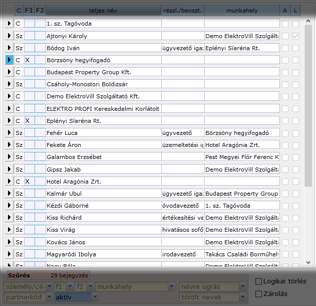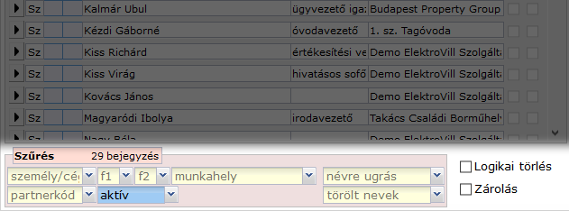 • Személy / Cég: csak a személyeket vagy csak a cégeket választja ki. Ha inaktív, akkor az összes rekord látszik.