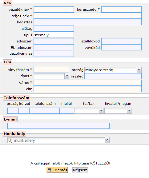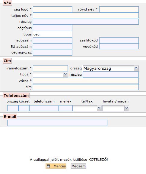 Kattintsunk a beviteli mezőkbe és billentyűzetről töltsük ki az adatokat. Minimálisan a csillaggal jelölt mezők kitöltése kötelező ahhoz, hogy a rendszer majd elmentse a partnerünket.
