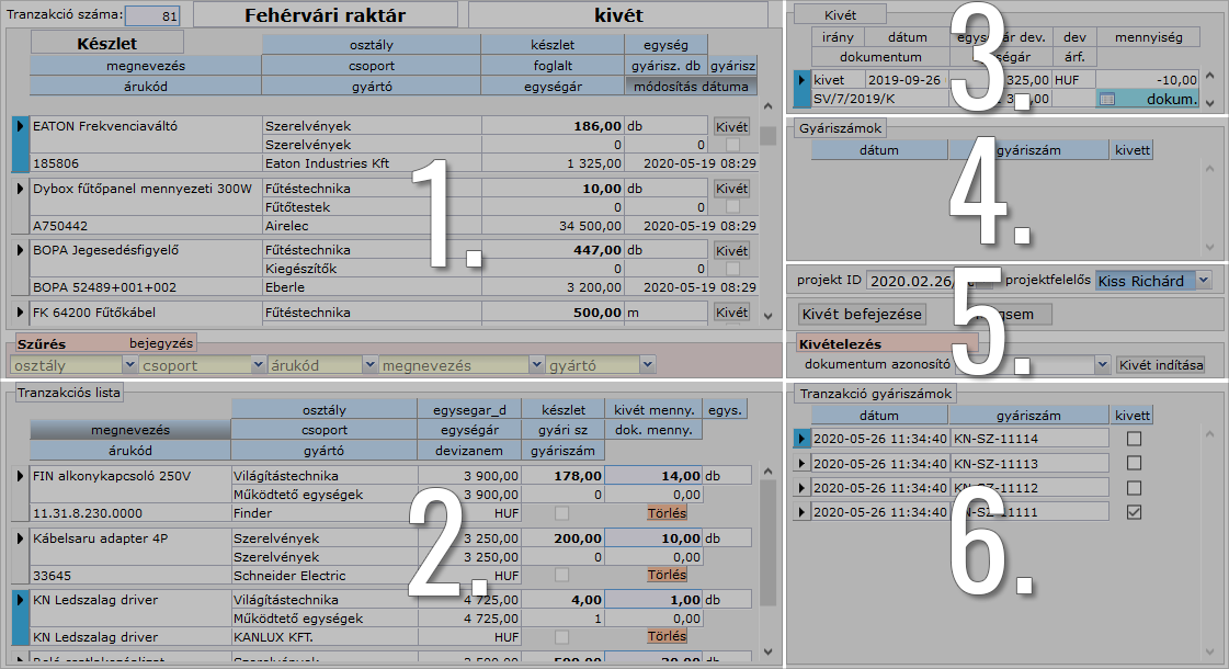 Ha gyári számos árucikket szeretnénk kivételezni, hiába írjuk be a tranzakciós listában a kivét mennyiséget, az ugyanis nem elegendő információ a készletkezelőnek. A gyári számos tételeknél az a kérdés, hogy pontosan melyik egyedi azonosítójú termékeket szeretnénk kivételezni, mivel kizárólag így követhető nyomon az árucikk életútja, ami a garanciális és szavatossági kérdésekben fontos.