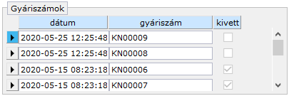 A lista egy eleme áll a gyári szám felvételének dátumából, a gyári egyedi azonosítóból és a készletinformációból. Utóbbi egy jelölőnégyzet, ami üres, ha a konkrét árucikk a raktárunkban van és pipa jelenik meg benne, ha már kivételezett státuszú.