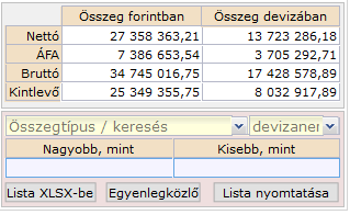 A kiválasztott is devizanem szűrőként működik, azaz a listát továbbszűri csak azokra a bizonylatokra, amik a választott devizanemben lettek kiállítva. Egyúttal az 'Összeg devizában' adatsorait is frissíti, így valós adatokhoz jutunk.